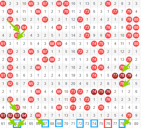 首先我们看下上期数据,和值为899。 奇偶比例为:9:11。 出了两组双连号,分别是42+43,49+50。出了一组五连号,60+61+62+63+64。 直连重号出了3个,分别是13,50,63,均为两连重号。未出现断层区域。我们把 01-40划分为前区,41-80划分为后区,则大号偏多,均为热号和温热号。