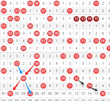上图是福彩快乐8开奖号码走势分布图其中一部分,我标注出来的数字16看黑色小箭头,跨度二斜连号码。标注出来的红色小箭头数字02跨度二隔一期斜连号码。标注出来的蓝色小箭头数字05是隔一期的斜连号码,这里三个数字02 05 16。