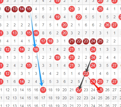 上图是福彩快乐8开奖号码走势分布图其中一部分,我标注出来的数字17看蓝色箭头隔四期的斜连号码一直从数字15一直走下来。数字22看黑色小箭头是隔一期的斜连号码,数字25看红色箭头是斜连号码,这里三个数字17 22 25。