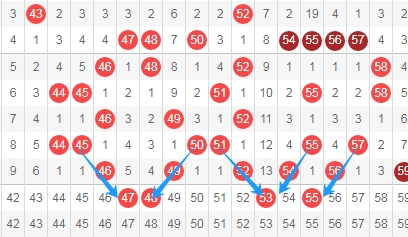 、上图是福彩快乐8开奖号码走势分布图其中一部分,我标注出来的数字47 48 53 55都是斜连号码,你们直接看上面走势图中标注出来的蓝色箭头吧,这里4个数字47 48 53 55。