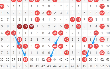 上图是福彩快乐8开奖号码走势分布图其中一部分,我标注出来的数字39 43 49都是隔一期斜连号码,你们直接看上面走势图中标注出来的蓝色箭头吧,这里3个数字39 43 49。