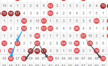 上图是福彩快乐8开奖号码走势分布图其中一部分,我标注出来的数字58 62 70这3个数字看上面标注出来的黑色小箭头都是斜连号码,标注出来的数字56是隔一期的斜连号码看上面标注出来的蓝色小箭头,这里4个数字58 56 62 70。