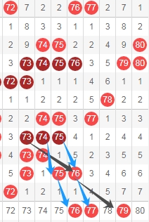 上图是福彩快乐8开奖号码走势分布图其中一部分,我标注出来的数字79看黑色箭头从数字73一直斜连过来,可以看跨度3的隔一期的斜连号码,数字76 77都是隔一期的斜连号码看蓝色小箭头,那么这里3个数字76 77 79。