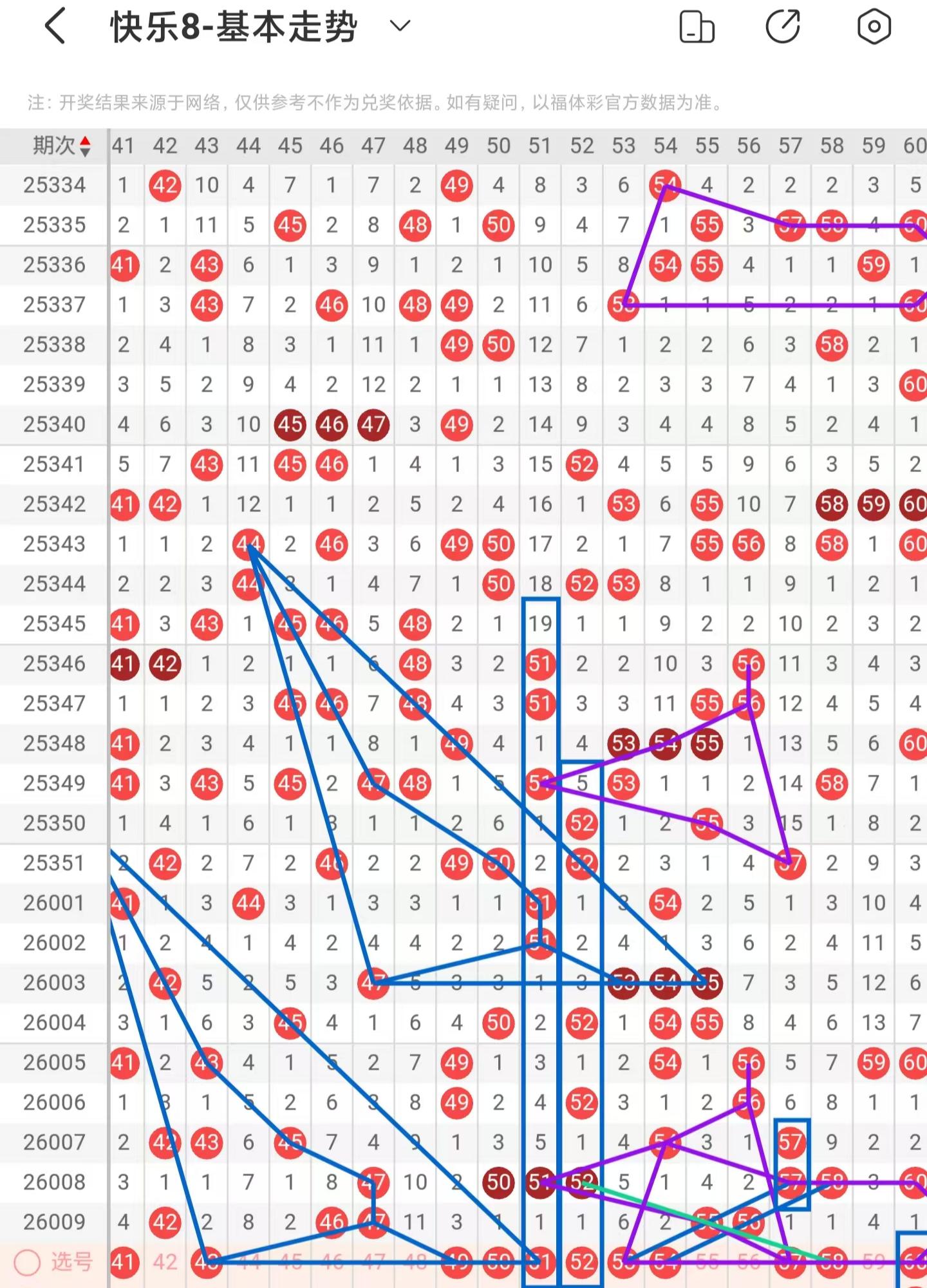 三区间上期小面积减少落号,一共开出五个号码球,本期考虑增加号码球的数量,注意隔期递增开出的41号码球,注意近期40、41、42、43、45、47号码球的走势与44、45、46、47、49、51号码球的走势相似,本期注意43、50号码球,阶梯落位重码走势注意47号码球,注意百期相似形态的51号码球,注意期数和值加减法的52号码球,阶梯落位连码走势注意53、54号码球,注意近期54、57、58、60、63、66号码球的走势相似,本期注意53、60号码球,近期51、54、55、57号码球的走势相似,本期注意57号码球,注意斜连走势回补的58号码球,因此三区间关注47-51-53-58-60,注意本区间的选二复式47-51-60。