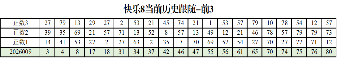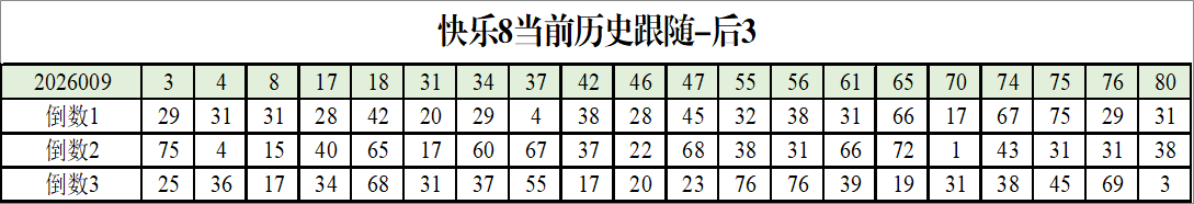 我感觉选热的同时,还要注意防冷条件开出,可以直接选取每个号码跟随出次前三的号码,也可以考虑把出次最后的三个数字加进去,不过这样可能号码太多,可以尝试。图上也能看出单独号码跟随的情况,我就不一一统计每个号码的出次了,我这里考虑提高概率,取每个号码历史跟随的前三号码和后三号码,根据2026009期的号码,我关注正数3和倒数3的号码号码为: