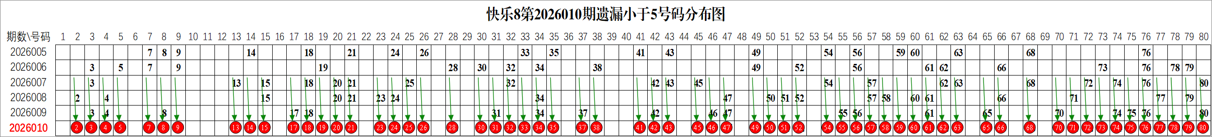 所以这个条件值得关注,从号码分布图上我们可以分析出,遗漏小于5期的号码有: