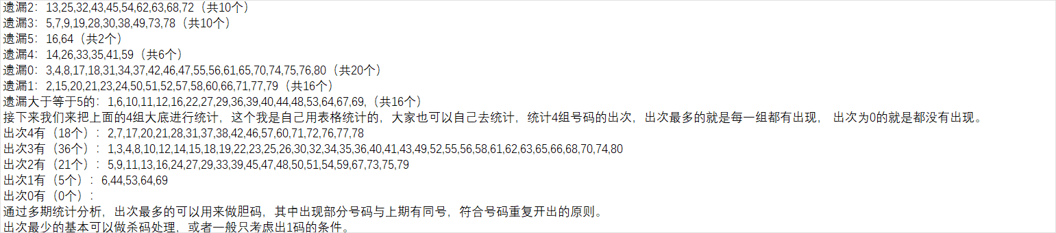 如果把对数和补数合起来有40个号码,中间可能还会产生一下重复数,通过近几期的统计分析,以上期数据进行补数对数计算推算下一期的概率不高。为提高概率,我主要是用前两期的数据来进行对数补数推算,然后再组成一个集合,作为我的第四组大底号码。