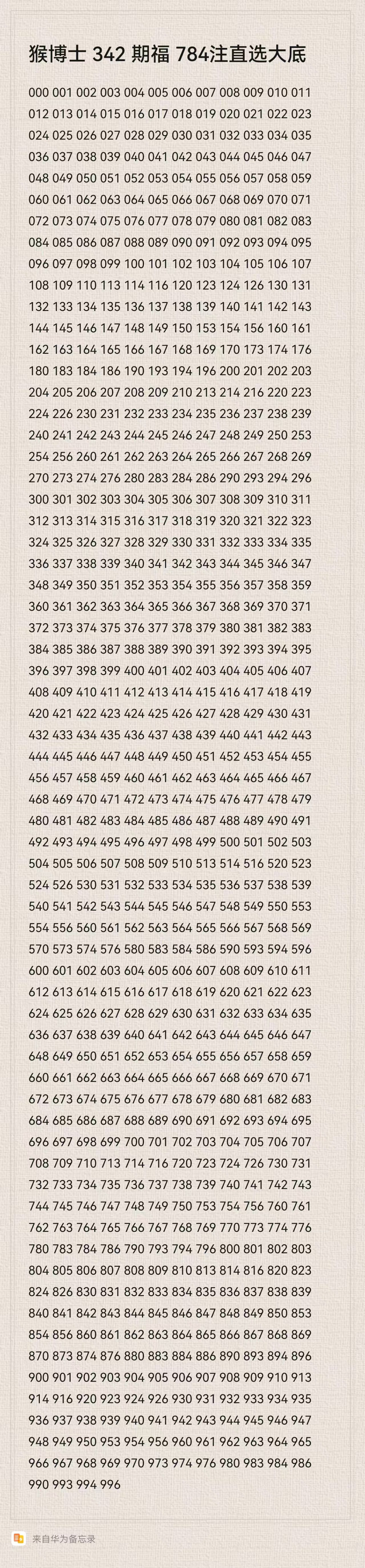 猴博士342期排列三784注直选大底:(可以当母底用,然后进行缩水)
