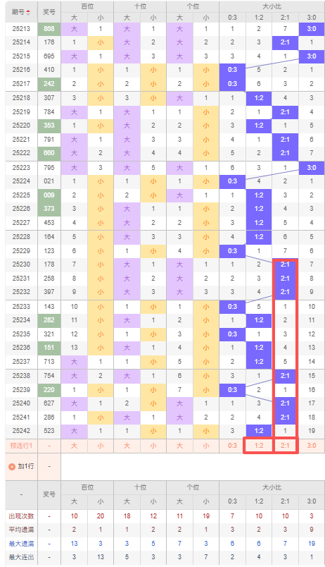 上期大小比:1:2,近10期大小比出现情况:0:3、1:2、0:3、1:2、1:2、2:1、0:3、2:1、2:1、1:2,最近10期出3期2:1,出现4期1:2,出现3期0:3,出现0期3:0,根据近10期出号规律本期看好大号,推荐隔期开出2:1,防连出1:2,综上所述大小比推荐:防:1:2,重点关注:2:1。