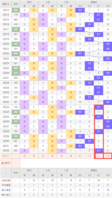 上期奇偶比:2:1,近10期奇偶比出现情况:2:1、0:3、2:1、3:0、3:0、2:1、0:3、1:2、0:3、2:1,最近10期出现4期2:1,出现1期1:2,出现3期0:3,出现2期3:0,根据近10期出号规律本期看好奇数,推荐连出2:1,防遗漏5期的3:0,综上所述奇偶比推荐:防:3:0,重点关注:2:1。
