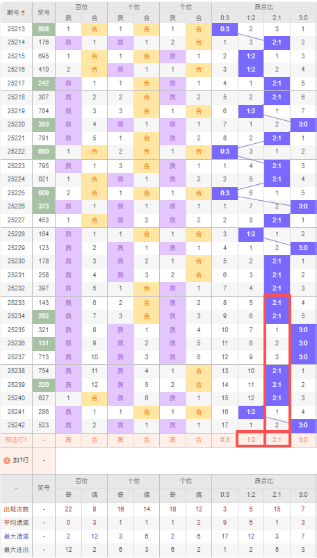 上期质合比:3:0,近10期质合比出现情况:2:1、2:1、3:0、3:0、3:0、2:1、2:1、2:1、1:2、3:0,最近10期出现5期2:1,出现1期1:2,出现0期0:3,出现4期3:0,根据近10期规律本期看好合数,推荐隔期开出1:2,防遗漏2期得2:1,综上所述质合比推荐:防:2:1,重点关注:1:2。