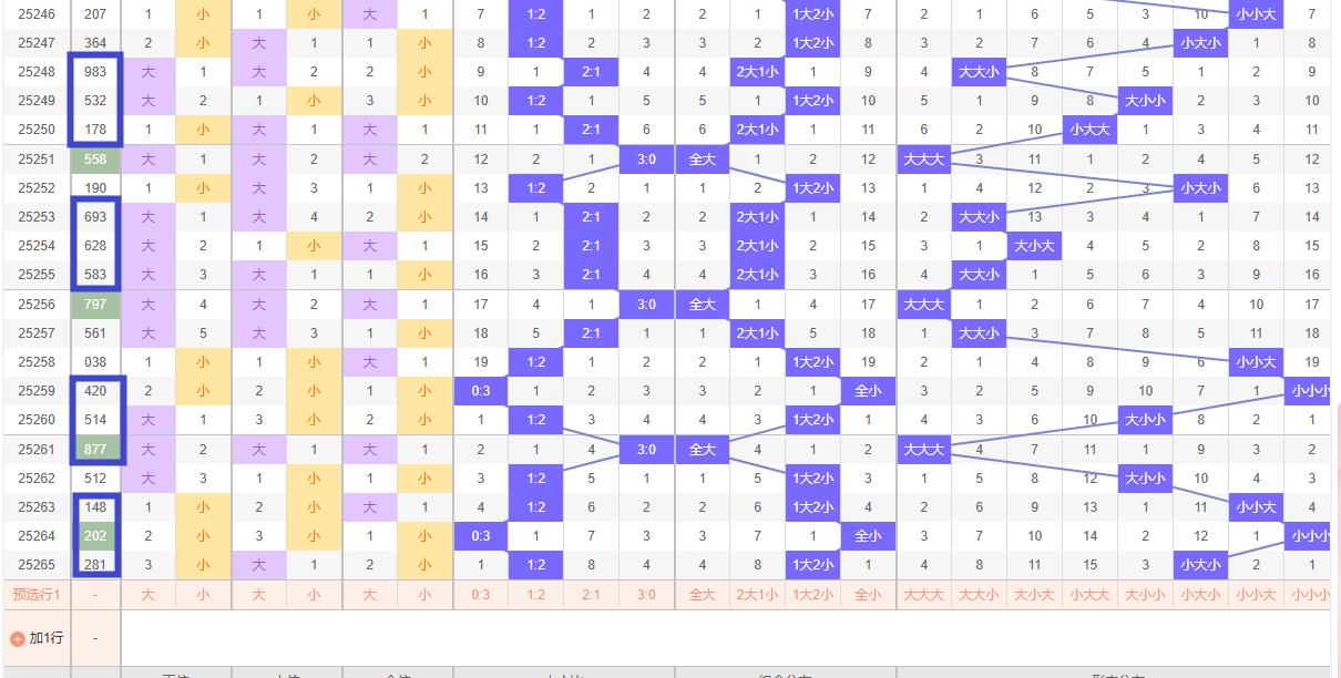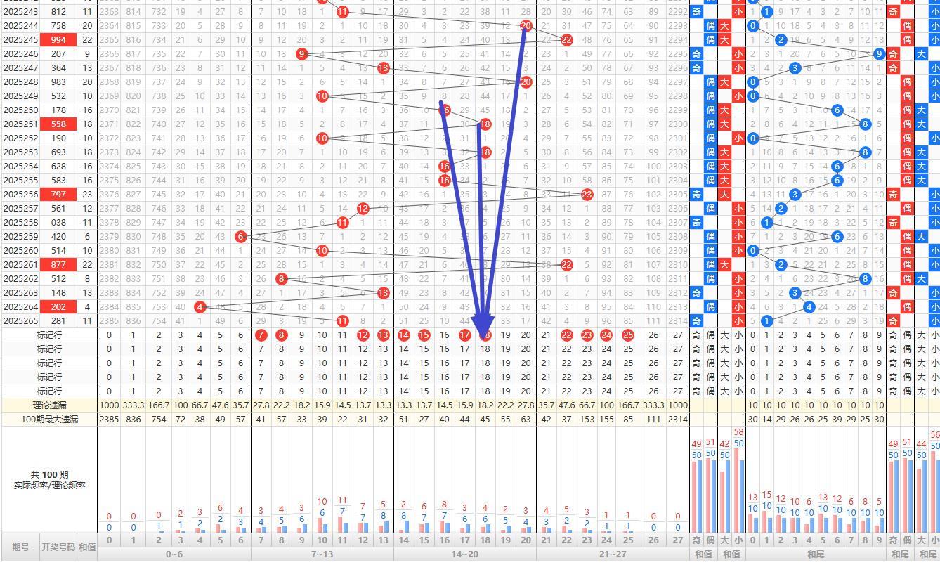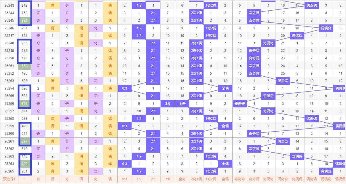 奇偶比例分析265期开奖号码为281.偶偶奇形态,奇偶比为1:2,偶数占据主导地位。在奇偶比例的分析中,同样注重平衡原则。考虑到近期奇偶比的波动,可以预判266期的奇偶比例将继续保持平衡,即可能为2:1或1:2。这样的预判不仅符合历史数据的统计规律,也体现了奇偶比例在短期内的调整趋势。
