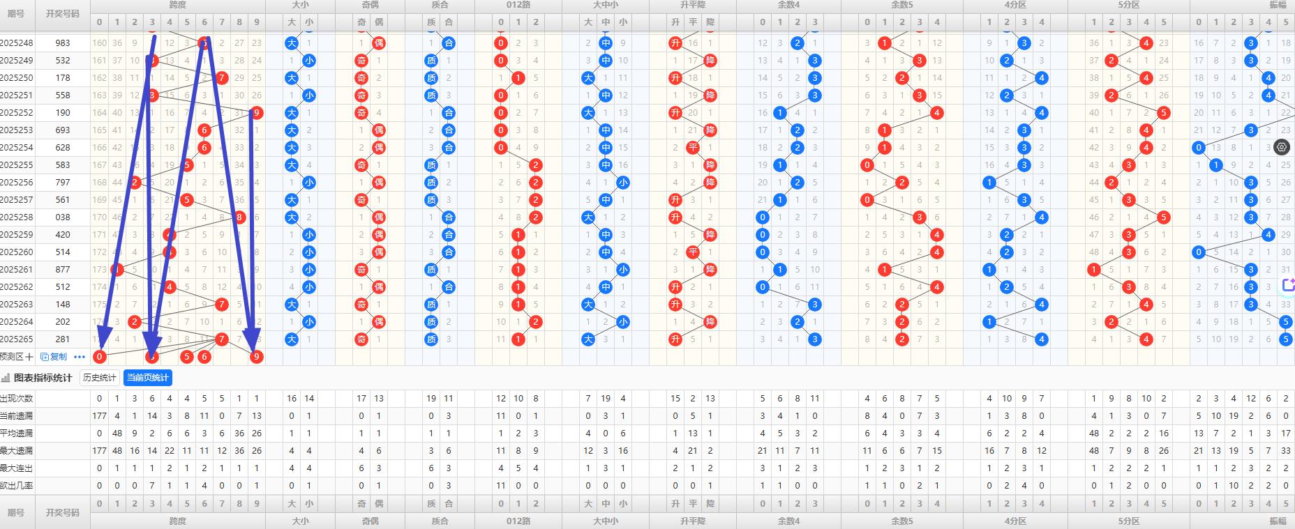 跨度分析 265期的开奖号码为281.跨度为7,这是一个相对中等的跨度值。在跨度走势的分析中,注意到跨度值常常在短期内呈现跳跃性变化,但长期内趋于稳定。因此,在266期中,预判跨度值将在3到8之间波动,特别是不看好跨度2和7的出现。这样的预判既考虑了跨度的跳跃性,也体现了跨度的稳定性原则,跨度预判为、0.3.5.6.9.近十期跨度值为2-5-8-4-4-1-4-7-2-7;012路 跨度比为0:6:4.关注0和2路跨度。(有组三面建议防)