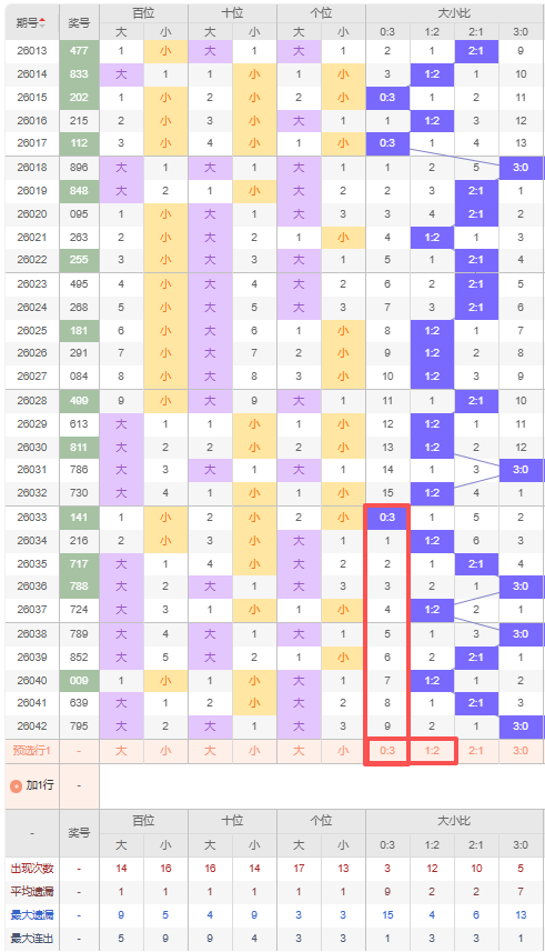 上期大小比:3:0,近10期大小比出现情况:0:3、1:2、2:1、3:0、1:2、3:0、2:1、1:2、2:1、3:0,最近10期出3期2:1,出现3期1:2,出现1期0:3,出现3期3:0,根据近10期出号规律本期推荐遗漏2期的1:2,防遗漏9期出0:3,综上所述大小比推荐:防:0:3,重点关注:1:2。