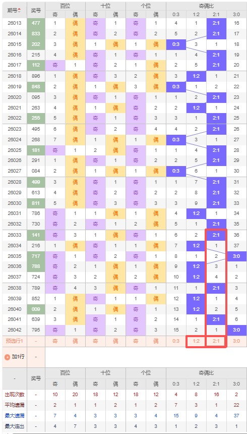 上期奇偶比:3:0,近10期奇偶比出现情况:2:1、1:2、3:0、1:2、1:2、2:1、1:2、1:2、2:1、3:0,最近10期出现3期2:1,出现5期1:2,出现0期0:3,出现2期3:0,根据近10期出号规律本期推荐隔期出2:1,防遗漏2期出1:2,综上所述奇偶比推荐:防:1:2,重点关注:2:1。