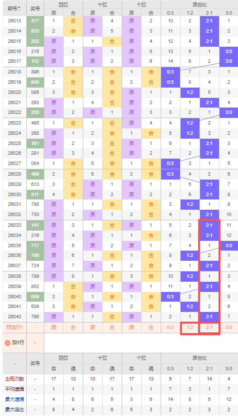 上期质合比:2:1,近10期质合比出现情况:2:1、2:1、3:0、1:2、2:1、1:2、2:1、0:3、1:2、2:1,最近10期出现5期2:1,出现3期1:2,出现1期0:3,出现1期3:0,根据近10期规律本期推荐连出2:1,防隔期出1:2,综上所述质合比推荐:防:1:2,重点关注:2:1。