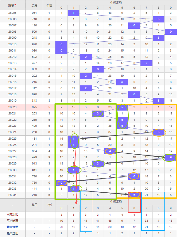 体彩排列3第2026035期的个位首先分析奇偶数号,如图所示近15期开出了10期奇数5期偶数,开出奇数概率是开出偶数概率的两倍,那么上期开出了偶数号,本期可以继续关注偶数号,偶数中首先考虑2号、8号已经遗漏了10期以上,并且都已经达到了最大遗漏期数,建议开出防冷号开出杀号建议定在奇数号,但是奇数号7号遗漏期数大值得考虑。
