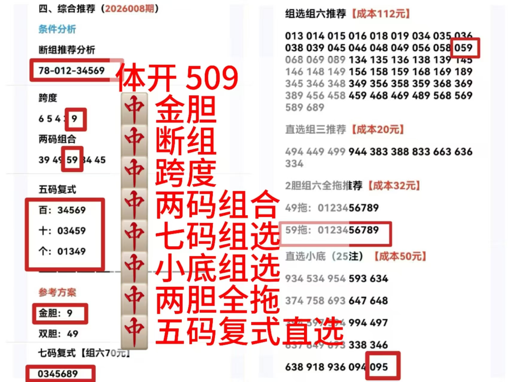 2026008期 命中组选,命中金胆,命中五码复式直选,命中小底组选,命中两胆全拖,命中七码组选
