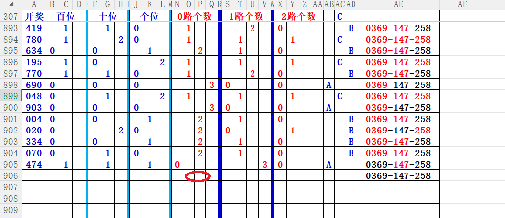 如上图56,012路分析0路出号的概率还是很大,本期可以0路号入手做胆0369中选;看好369胆码