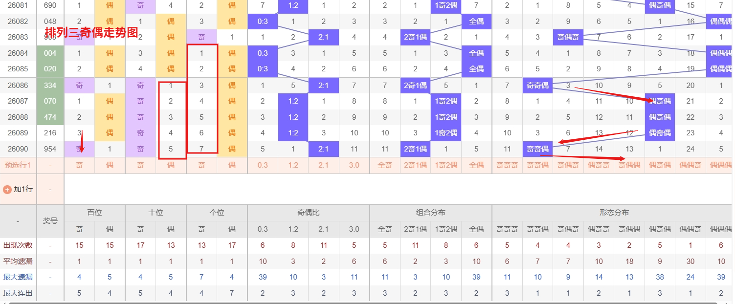 排列三 奇偶分析:从上图可以看出排列三100期内百位奇偶比约为45比55,十位奇偶比为53比47,个位奇偶比为54比46,十位的比值比较均衡,但是个位的比值偏差就有点大,历史奇偶形态近2期开出奇奇偶后下一期的走势为,第002期开出奇奇偶后003期开奇奇奇, 第017期开出奇奇偶后第018期开偶偶奇,第035期开出奇奇偶后第036期开偶奇奇,近期排列三奇偶走势中,奇奇奇作为明显热出的形态,近期连下或隔期重现的频率较高,热度持续集中,从走势惯性来看,强势形态往往具备连出的动能,接下来仍需防范其继续表现,可作为追热策略的核心选项。与此同时,偶奇奇则属于典型的冷态,已经连续多期未开出,遗漏值逐步累积,在热形态反复走强的背景下,冷形态的回补压力也在同步增加,尤其当奇数主导的局面出现松动时,偶奇奇有望迎来反弹。所以排列三2026091期奇偶形态推奇奇奇与偶偶奇。