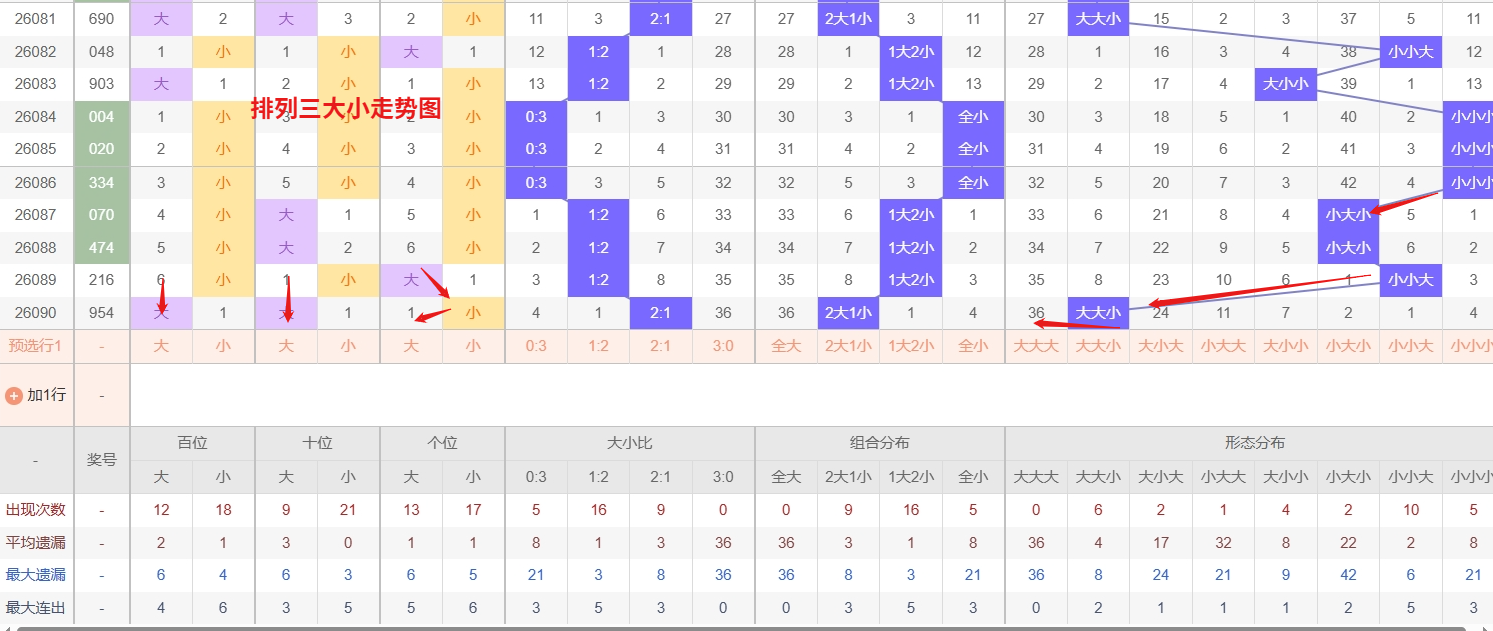 排列三 大小形态分析:从大小走势图上可以看出排列三100期内百位大小比约为49比51,十位大小比约为45:55,个位大小比约为54比46,除了个位奇数比偶数多,十位和百位偶数比奇数多。历史数据近2期开出大大小下一期的走势为,第007期开大大小后第008期开小大大。第013期开出大大小后第014期开大大大,第035期开出大大小后036期开大小大。近期排列三大小走势中,大大大和大小大均属于明显的冷号形态,两者已经连续多期未开出,遗漏值持续累积,从历史出号规律来看,极端冷态往往伴随着较强的回补需求。大大大作为全大组合,在近期小号主导的局面下压制已久,一旦大号集体反弹,该形态有望率先回补;而大小大则呈现“大-小-大”的交错结构,介于全大与全小之间,具备较好的过渡属性,其冷态积累同样不容忽视。所以排列三第2026091期大小形态推荐大大大防大小大。