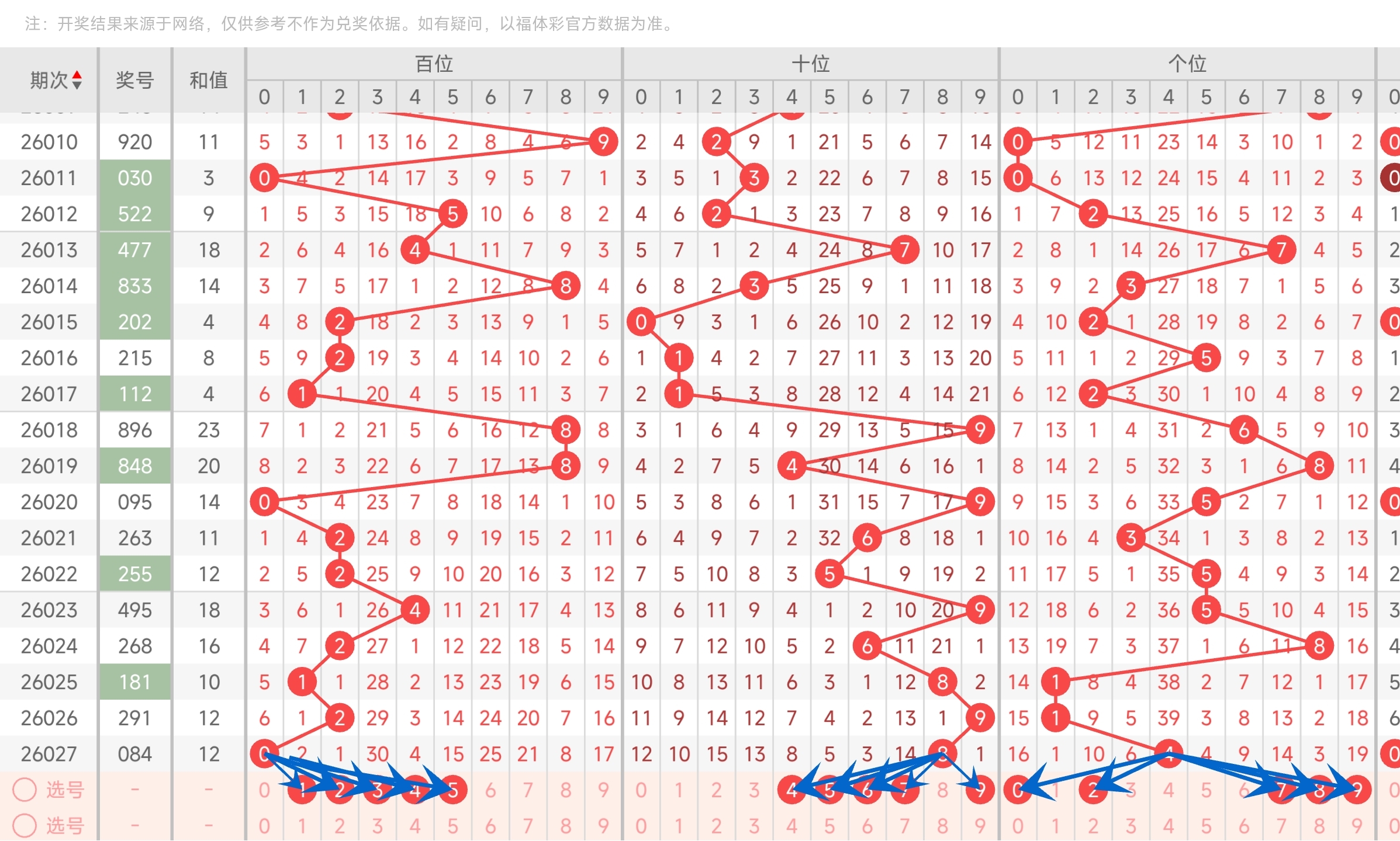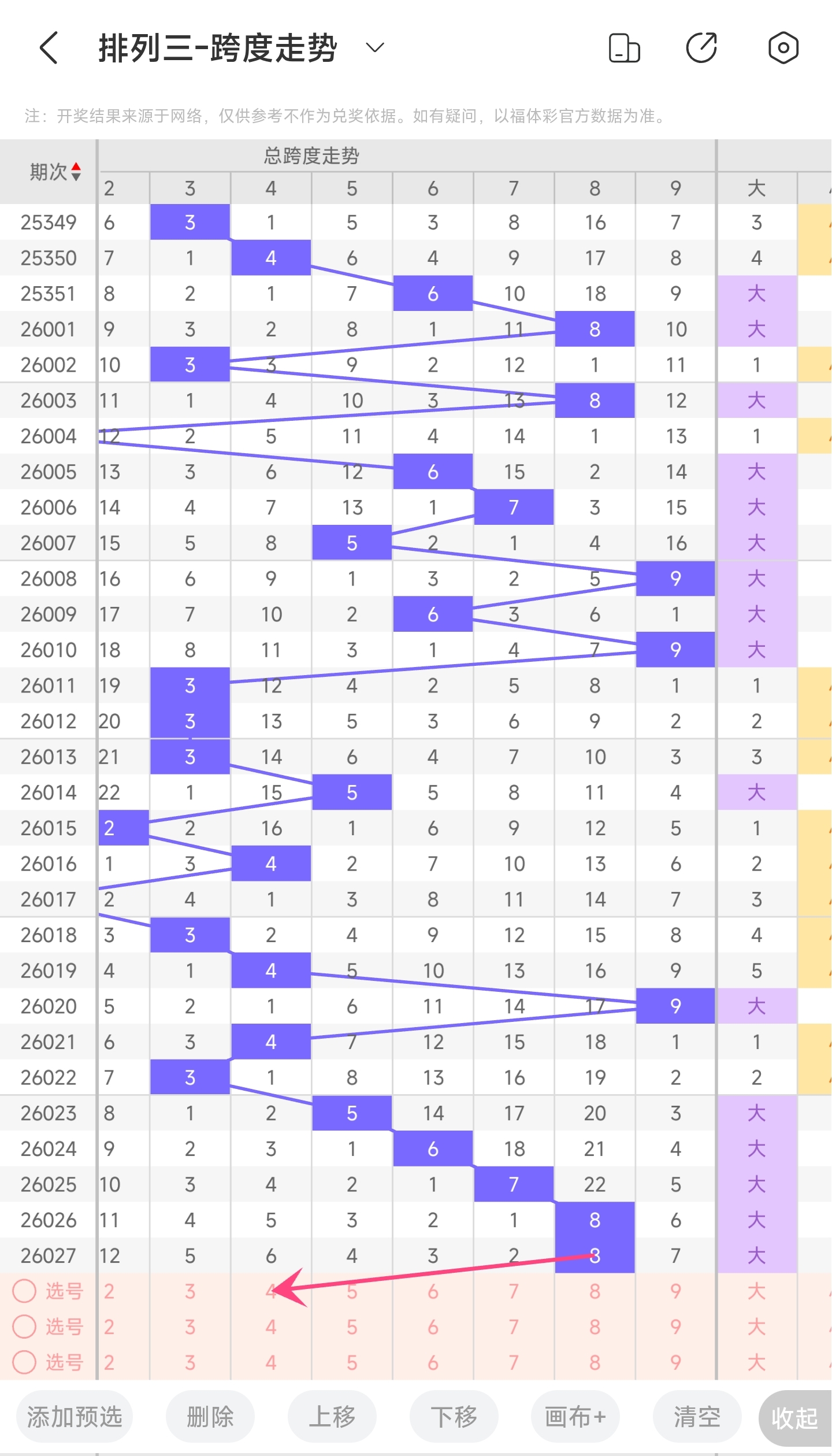 上期跨度为8,往前一期跨度是8,趋势没有移动,偏移量为0。跨度值8时,跨度值是近30期开出比较大的值。通过走势图分析,目前的趋势是大概率往左,小概率往右。所以推测本期跨度可能为34567等跨度。