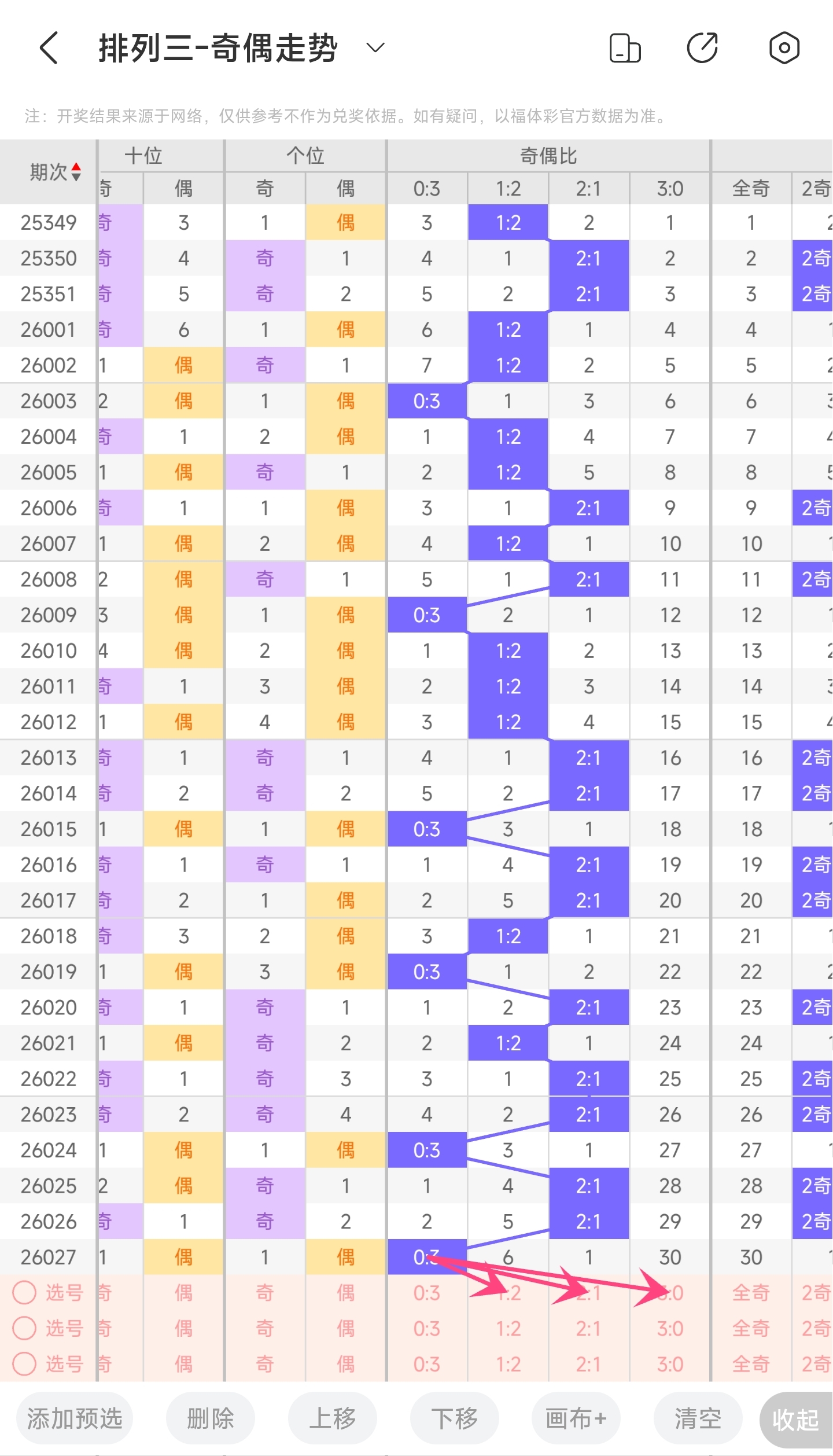 上期开出了0:3的奇偶比。往前一期是2:1奇偶比。通过分析奇偶走势图,近30期内开出1:2奇偶比的次数是11次,开出2:1奇偶比的次数是13次,3:00次,0:36次。和前一期相比,0:3次数变多,3:0次数变少。通过走势图分析,上期开0:3奇偶比,本期看好1:2奇偶比。所以推测本期可能开1:2奇偶比,其次是2:1奇偶比,最后是3:0或者0:3奇偶比。