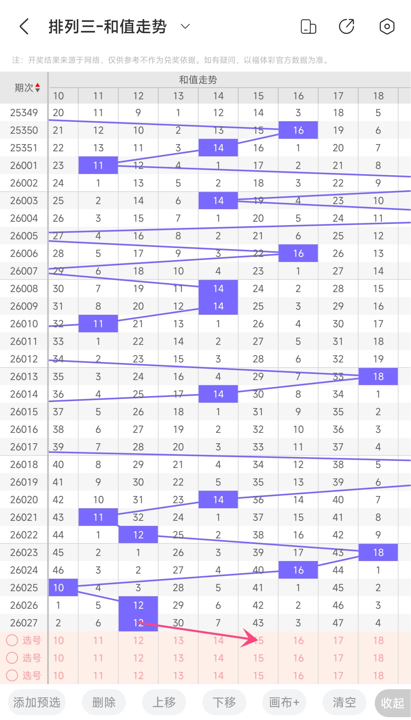 上期和值为12,往前一期和值为12,趋势没有移动,偏移量为0。通过走势图分析,12和值是近30期内开出比较小的和值,上升空间比较大,下降空间比较小。本期看好和值变大,因此推测本期趋势是往右的,和值会变大,小概率往左,和值变小。