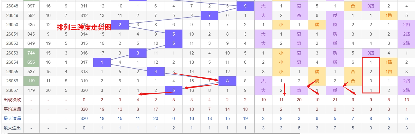 排列三 跨度分析:从上图可以看出近100期的跨度大小比约为45比55,跨度奇偶比约为48比52总体来看还是比较均衡的,但跨度大小之间有点差异。我们再从历史开出5跨后下一期7跨度数据来做参考。最近10期跨度大小比约为5:5期开出小数跨度过多返回大数跨度的概率更高一点。历史开奖近2期出5跨以后的走势为332期开出7跨后下一期走2跨走出5振幅,第357期开出5跨后下一期走7跨走2振幅第014期开出5跨后下一期开出3跨走出2振幅。连续多期大振幅,近期排列三跨度走势观察,7跨作为热号近期表现极为活跃,频繁现身且连落或隔期回补的节奏较为紧凑,显示出较强的热度惯性,接下来需重点防范其凭借强势姿态继续连下的可能;与此同时,2跨作为温号正呈现出明显的回暖迹象,在最近10期内现身频率逐步增加,尤其是其回补节奏有所加快,显示出转热的潜力,值得密切关注。综合来看,未来几期跨度选择上可采取热温兼顾的策略,既要留意热号7跨的延续性表现,也需对温号2跨的升温趋势保持警惕,跨度走出1到5个振幅看好的跨度有2367跨,所以第2026058期排列三跨度推荐2367跨。