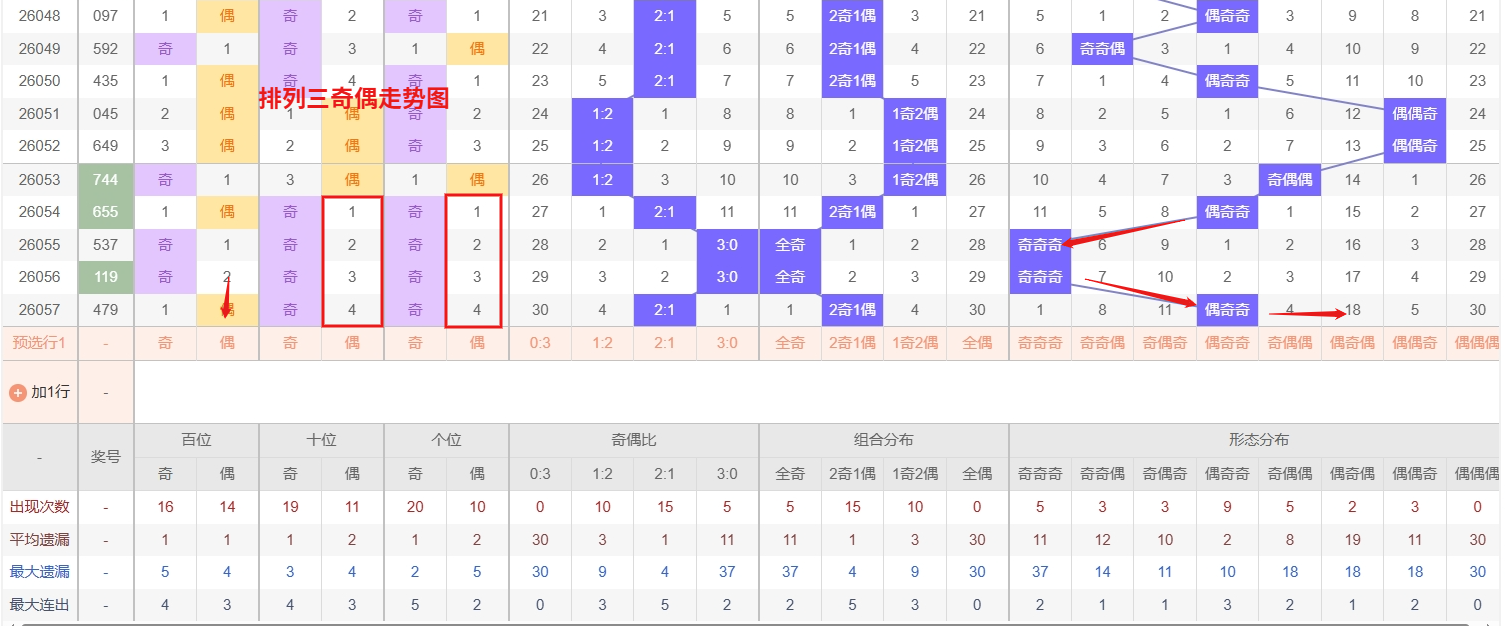 排列三 奇偶分析:从上图可以看出排列三100期内百位奇偶比约为48比52,十位奇偶比为55比45,个位奇偶比为51比49,个位的比值比较均衡,但是十位的比值偏差就有点大,历史奇偶形态近2期开出偶奇奇后下一期的走势为,第331期开出偶奇奇后332期开偶奇偶, 第347期开出偶奇奇后第348期开奇偶偶,第017期开出偶奇奇后第018期开偶偶偶,近期排列三奇偶形态的走势来看,奇偶偶组合作为热号,近期现身频率较高,且连落或间隔短周期内反复出现的特征较为明显,显示出较强的热度惯性,接下来需防范该形态凭借当前热度继续走强;与此同时,偶奇偶与偶偶偶组合目前均处于深度冷态,遗漏周期已远超理论值,随着冷态回补压力的不断积累,其反弹需求正逐渐增强,近期需重点关注这两类冷门形态在特定位置上的解冻信号。综合来看,未来几期奇偶搭配的选择上可采取热冷兼顾的策略,既要留意奇偶偶形态的延续性表现,也需对偶奇偶与偶偶偶的潜在回补机会保持警惕,所以排列三2026058期奇偶形态推偶奇偶与奇偶偶。