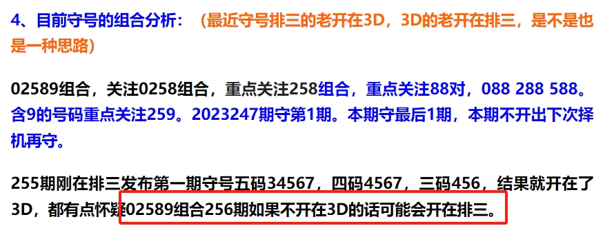 2023256期说的02589组合可能会开在排列三,没有想到2023257期还真的就开在了排三,而且新增的89012组合重点关注的就是890这一注组六。守号开在兄弟家感觉都成常态了,每期我都有在文章中强调:最近守号排三的老开在3D,3D的老开在排三,是不是也是一种思路。
