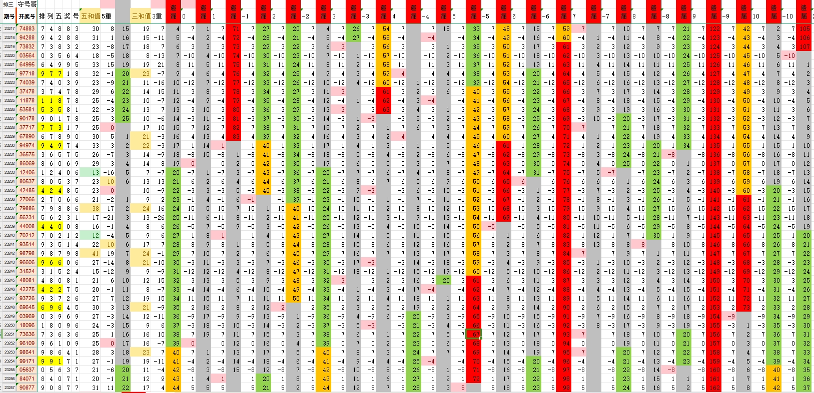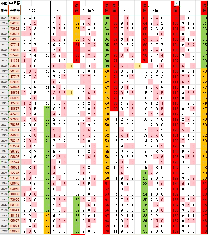 万位:近100期内,89组合带出过4,本期看好894组合继续带出4。近期的落号9089,908/089,三期连续的号码都是089,如果规律继续,本期看好890组合带出0。2023252期的9是由7带出的,本期看好9带出7,刚好形成三期顺子组合789,近100期内9带出7出现过4次。防遗漏1期的8,上上次的8开出也是遗漏1期。9最近7次落号中,有4次重下。本期防9再次重下。防0路号继续走热,本期防其它0路号36。