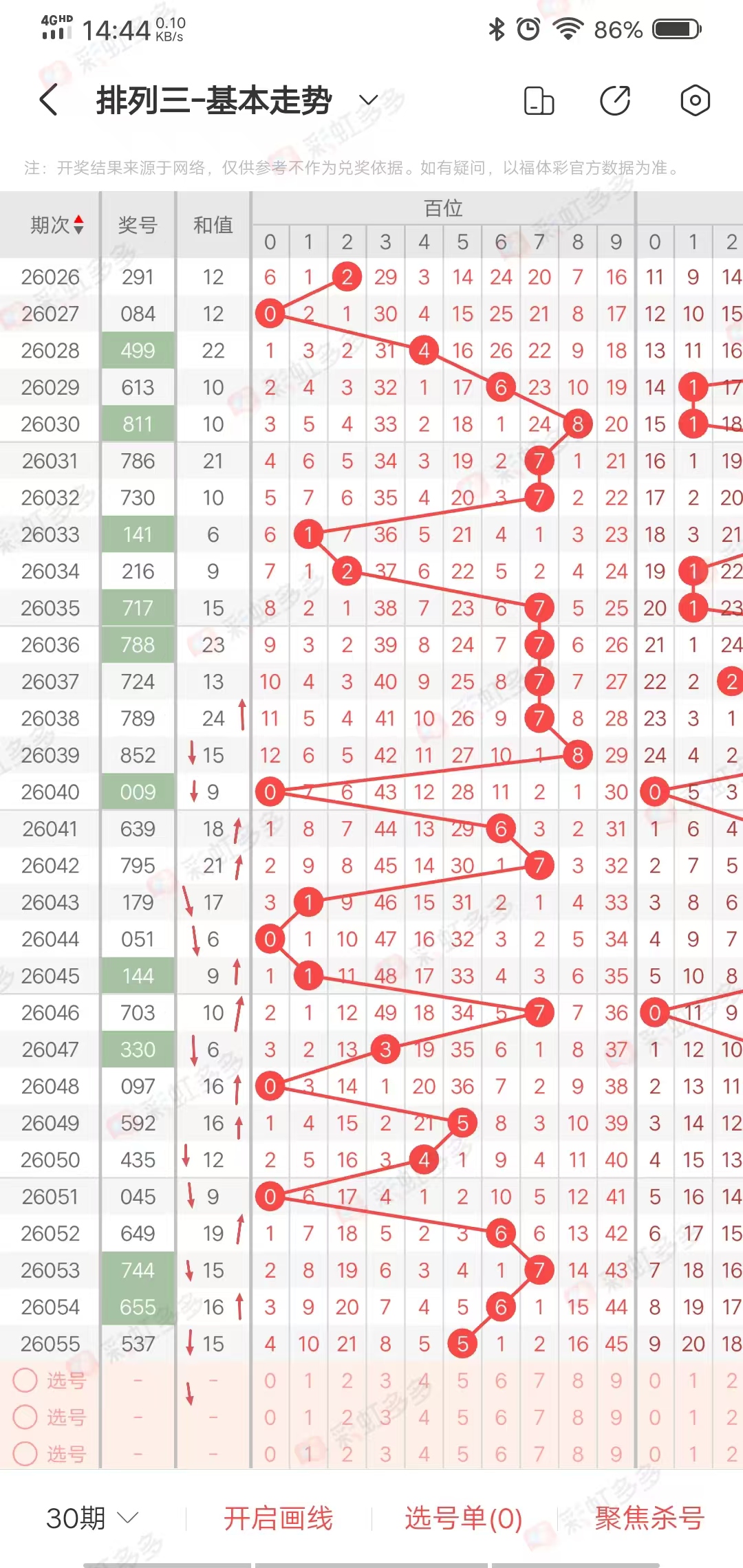 从走势图可以看出,近期幅度-6➕9➕3-4-11➕3➕1-4➕10➕0-4-3➕10-4➕1-1,上下幅度11左右,近20期多走连续上下走势,上期下降,本期有继续下降走势,综合和值在10-18之间,
