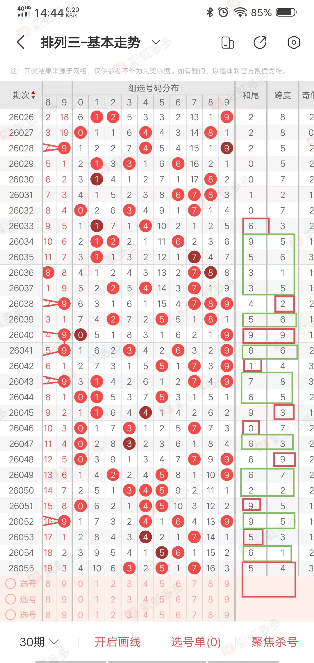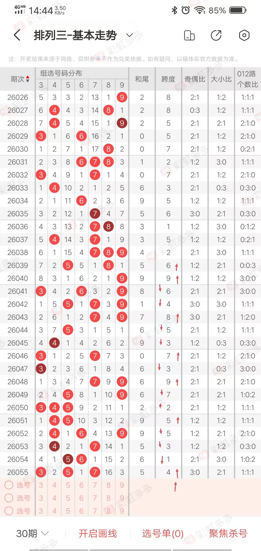 从走势图可以看出,近期跨度幅度➕4-3➕4➕3-3-2➕4-3-2➕4-4➕6-2-5➕3➕0-2-2➕3,幅度在上下5左右,近15期多走一上升多下降走势,上期上升,本期有上升走势,综合跨度56789,