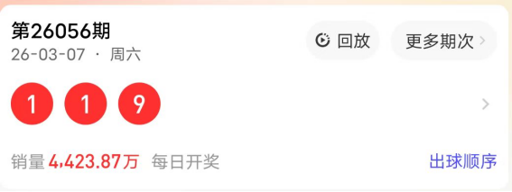 2026056期开奖号码为119,奇偶值为3奇;大小值为1大2小;012路走势为011路;跨度为8跨;和值11点;组三形态。