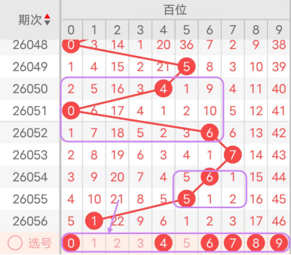 近7期(050~056)开奖号百位号码球分别为4、0、6、7、6、5、1,开奖号与上一期走出的振幅分别为1、4、6、1、1、1、4。050期走出4号中小数号码球,走出“1”的小幅度,051期走出0号小数号码球,走出“4”的中小幅度,052期走出6号中大数号码球,走出“6”的中大幅度,053期走出7号大数号码球,走出“1”的小幅度,054期走出6号中大数号码球,走出“1”的小幅度,055期走出5号中大数号码球,走出“1”的小幅度,056期走出1号小数号码球,走出“4”的中小幅度;从振幅大小及走势图的整体形势来看,中大幅度走在5~8之间较为适宜,中小幅度走在1~3之间较为适宜;结合走势图的整体及大小走势分析,本期百位需重点关注号码球为0、4、6、7、8、9。