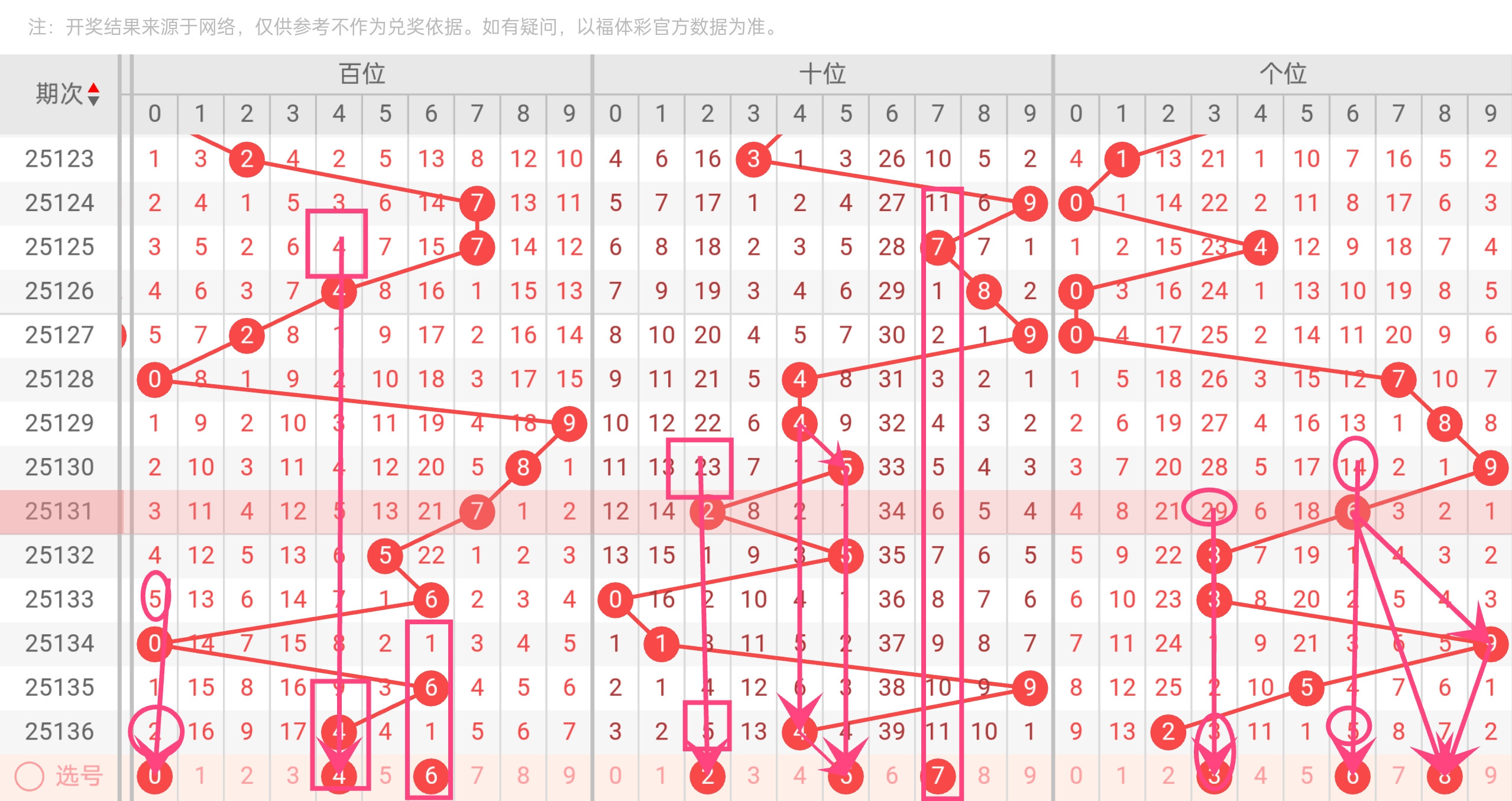 百位小号(0-4)占比62%,显著高于大号,推荐以小号为主,0、4、6兼顾大小均衡。