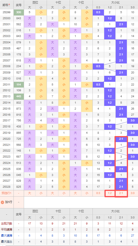 上期大小比:2:1,近10期大小比出现情况:3:0、2:1、3:0、1:2、3:0、1:2、2:1、1:2、2:1、2:1,最近10期出4期2:1,出现3期1:2,出现0期0:3,出现3期3:0,根据近10期出号规律本期推荐三连出2:1,防遗漏2期出1:2,综上所述大小比推荐:防:1:2,重点关注:2:1。