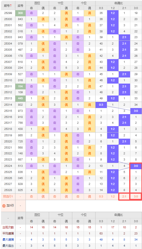 上期奇偶比:1:2,近10期奇偶比出现情况:1:2、2:1、1:2、1:2、1:2、3:0、1:2、1:2、1:2、1:2,最近10期出现1期2:1,出现8期1:2,出现0期0:3,出现1期3:0,根据近10期出号规律本期推荐遗漏4期出3:0,防遗漏8期出2:1,综上所述奇偶比推荐:防:2:1,重点关注:3:0。
