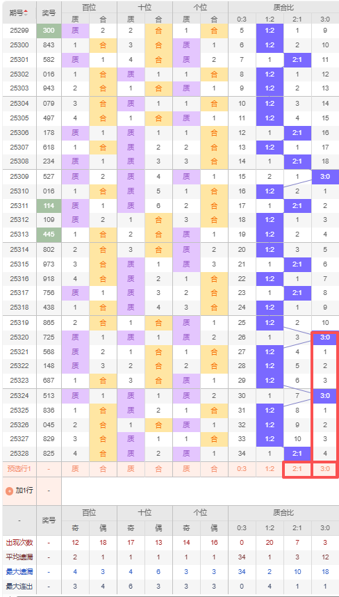 上期质合比:2:1,近10期质合比出现情况:1:2、3:0、1:2、1:2、1:2、3:0、1:2、1:2、1:2、2:1,最近10期出现1期2:1,出现7期1:2,出现0期0:3,出现2期3:0,根据近10期规律本期推荐遗漏4期出3:0,防连出2:1,综上所述质合比推荐:防:2:1,重点关注:3:0。