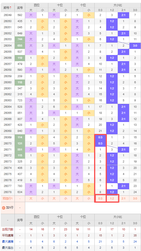 上期大小比:1:2,近10期大小比出现情况:0:3、0:3、2:1、1:2、1:2、1:2、1:2、1:2、2:1、1:2,最近10期出2期2:1,出现6期1:2,出现2期0:3,出现0期3:0,根据近10期出号规律本期推荐遗漏8期的0:3,防连出1:2,综上所述大小比推荐:1:2,重点关注:0:3。