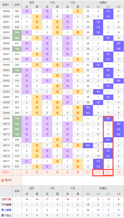 上期奇偶比:1:2,近10期奇偶比出现情况:2:1、3:0、3:0、3:0、2:1、0:3、2:1、2:1、1:2、1:2,最近10期出现4期2:1,出现2期1:2,出现1期0:3,出现3期3:0,根据近10期出号规律本期推荐遗漏2期的2:1,防三连出1:2,综上所述奇偶比推荐:1:2,重点关注:2:1。