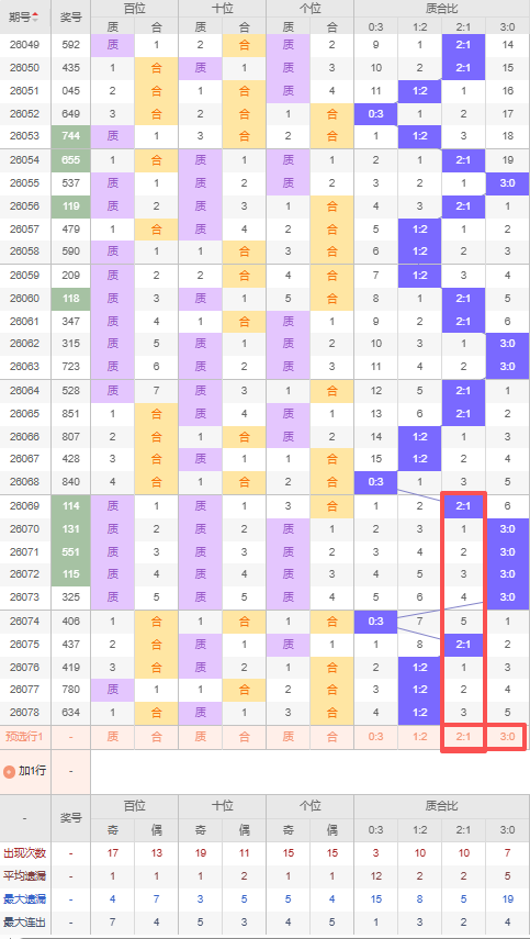 上期质合比:1:2,近10期质合比出现情况:2:1、3:0、3:0、3:0、3:0、0:3、2:1、1:2、1:2、1:2,最近10期出现2期2:1,出现3期1:2,出现1期0:3,出现4期3:0,根据近10期规律本期推荐遗漏5期出3:0,防遗漏3期出2:1,综上所述质合比推荐:2:1,重点关注:3:0。