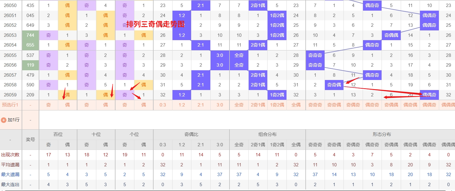 排列三 奇偶分析:从上图可以看出排列三100期内百位奇偶比约为45比55,十位奇偶比为51比49,个位奇偶比为54比46,十位的比值比较均衡,但是百位的比值偏差就有点大,历史奇偶形态近2期开出偶偶奇后下一期的走势为,第337期开出偶偶奇后338期开偶奇奇, 第345期开出偶偶奇后第346期开偶偶偶,第017期开出偶偶奇后第018期开偶奇偶,近期排列三奇偶形态的走势来看,奇偶偶组合作为热号,近期排列三奇偶走势来看,偶奇奇作为热号近期表现活跃,其开出频率显著高于其他形态,且热号在短期内往往具备惯性,仍有连开或隔期回补的可能,因此需继续关注这一组合的延续性;与此同时,偶偶偶作为冷号目前遗漏已达32期,已远远超出其理论周期,这种极端冷态往往积聚了较强的回补动能,从历史数据来看,长期未出的形态在达到临界点后极易出现反弹,因此近期需将偶偶偶的冷号回补作为重点防守方向。总体而言,当前奇偶策略应以热号偶奇奇的惯性延续为主攻点,同时重点防范冷号偶偶偶的深度回补, 所以排列三2026060期奇偶形态推偶奇奇与偶偶偶。