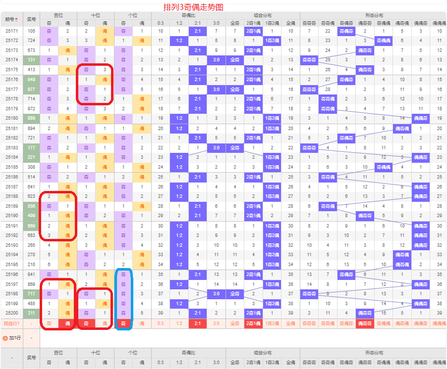 上一期的奇偶比为2:1,两奇的号码组合,从近五期的奇偶数出现情况看,奇数出8次,偶数出现7次,奇数偶数号码出现较平均,本期要侧重两奇的号码组合,侧重偶奇奇或偶奇偶的号码组合,根据奇偶组合形态可做五码定位024689/13579/13579或024689/13579/024689