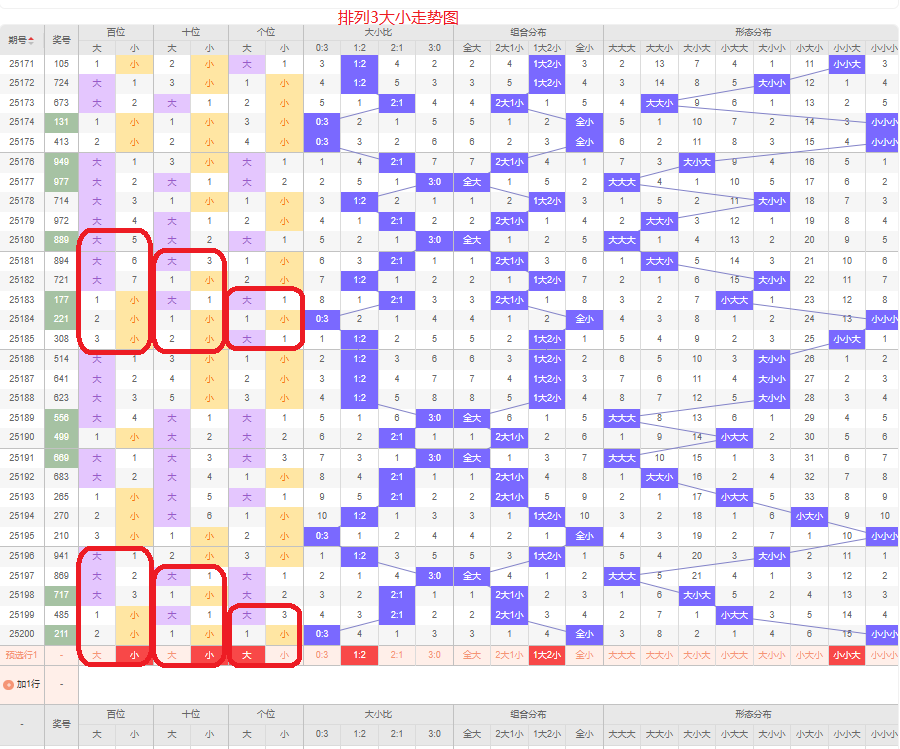 上一期大小比为0:3,全小的号码组合,近五期大号出8次,小号出7次,大小号码出现较平均,上一期是两小的号码组合,本期侧重两小的号码组合,百位本期侧重小号码,十位本期侧重小号码,个位侧重大号码,侧重小小大或小大大的号码组合,根据大小形态五码定位01234/01234/56789