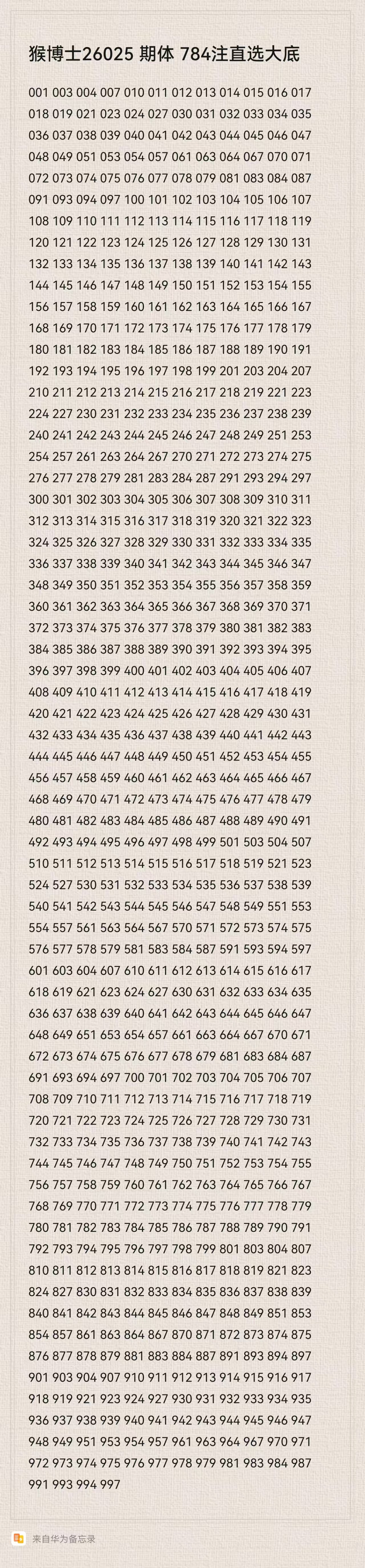 猴博士26025期排列三784注直选大底:(可以当母底用,然后进行缩水)