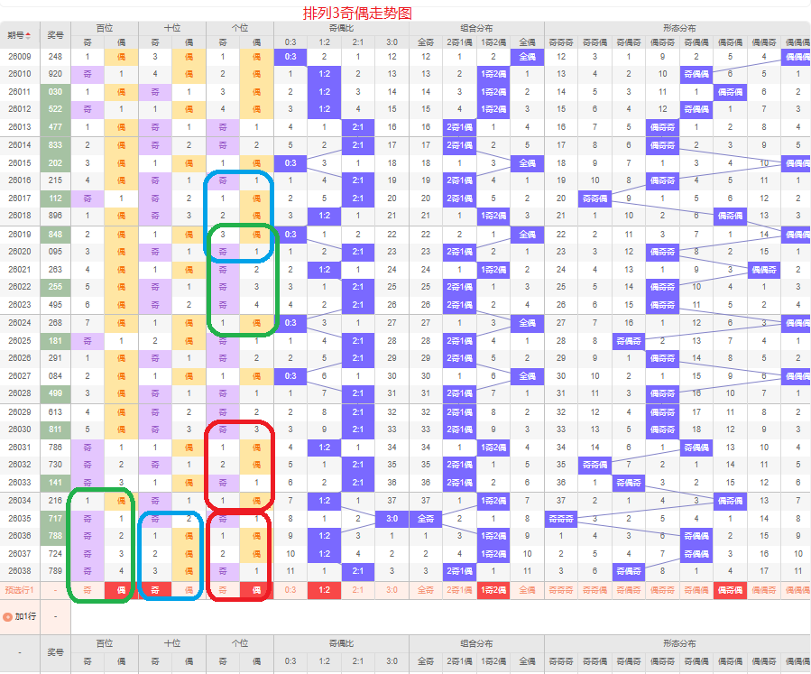 上一期的奇偶比为1:2,两偶的号码组合,从近五期的奇偶数出现情况看,奇数出8次,偶数出现7次,奇数偶数号码出现较平均,本期要侧重两偶的号码组合,侧重偶奇偶或偶奇奇的号码组合,根据奇偶组合形态可做五码定位02468/13579/02468或02468/13579/13579