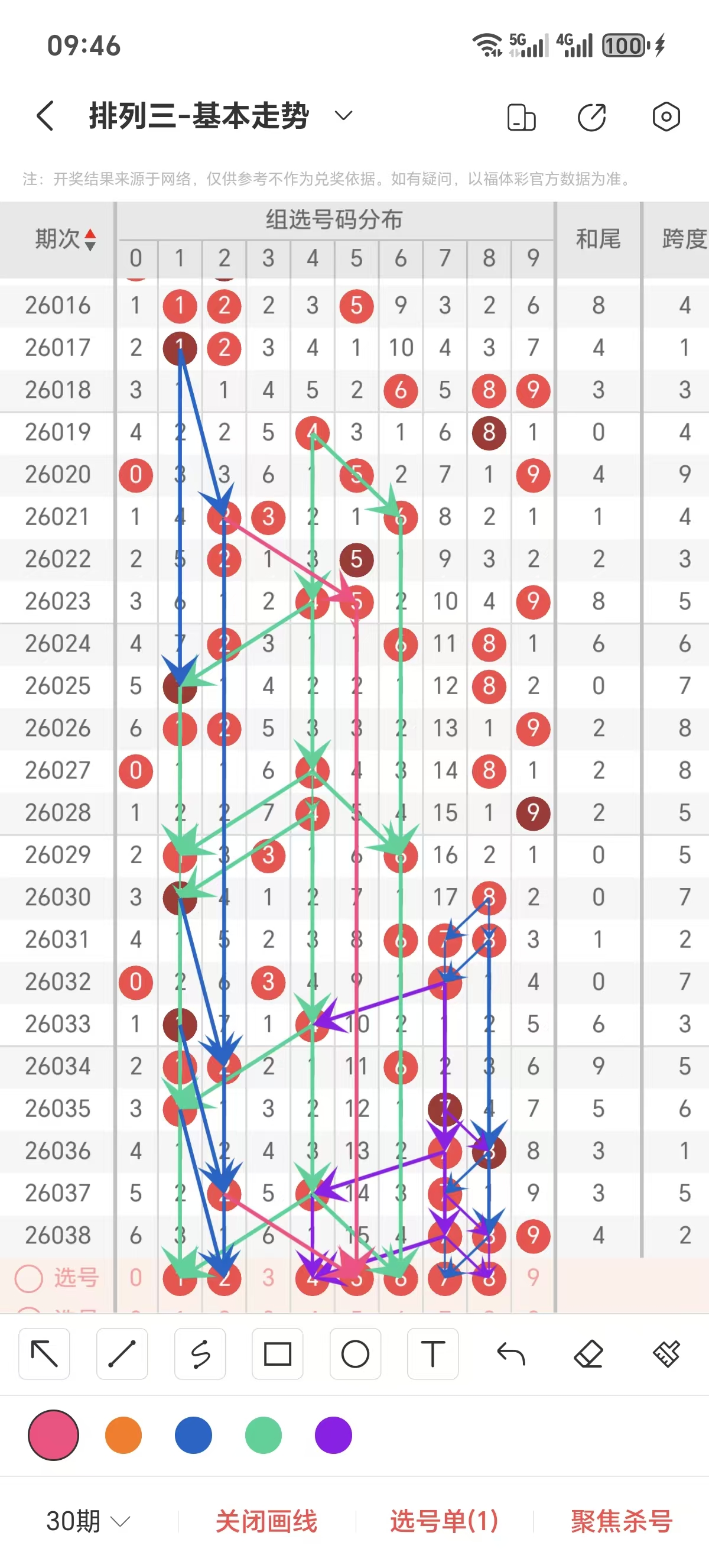 通常情况下在五期之内重复一个跨度的概率较高,近五期重复了5的跨度,近五期跨度为5/6/1/5/2,近期02路的跨度较热,本期要侧重3/5/7跨为主的号码组合。选择好跨度就可以从跨度方面选择相应的双胆码组合,双胆码的选取要根据近期和历史的走势进一步的分析选取。