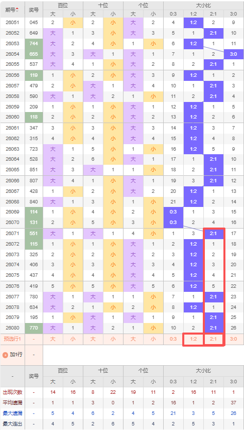 上期大小比:2:1,近10期大小比出现情况:2:1、1:2、1:2、1:2、1:2、1:2、2:1、1:2、2:1、2:1,最近10期出4期2:1,出现6期1:2,出现0期0:3,出现0期3:0,根据近10期出号规律本期推荐遗漏2期的1:2,防三连出2:1,综上所述大小比推荐:2:1,重点关注:1:2。